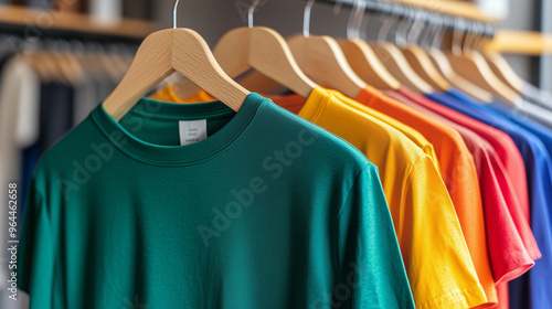 Kolekcja żywych, kolorowych koszulek na drewnianych wieszakach w sklepie zachęca do zakupu.