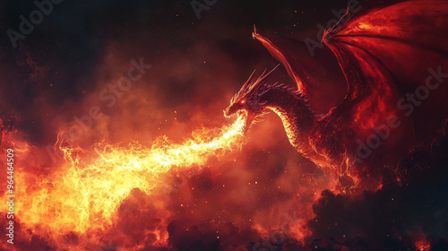 Czerwony smok oddaje ognisty oddech, który wypełnia powietrze iskrami i płomieniami. Jego potężna postura i ognisty wybuch podkreślają jego mityczną moc