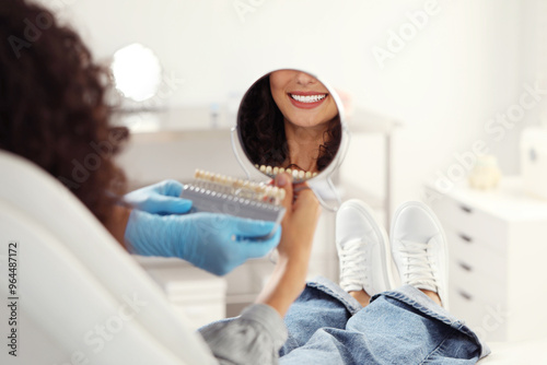Patient looking in mirror while doctor holding teeth color chart in clinic, closeup. Dental veneers