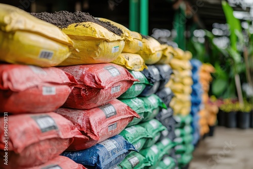 A vibrant display of colorful fertilizer bags stacked neatly, ready for a blooming garden.