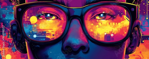 Stylized nerd face with large glasses, a quirky smile, and digital gadgets, set against a vibrant, techthemed backdrop with bold colors and intricate details