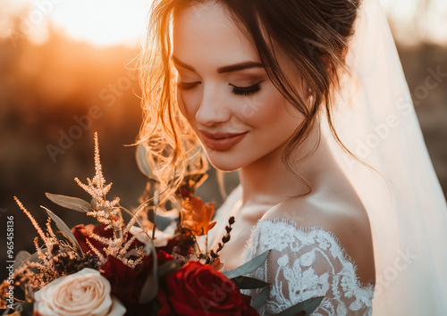 Piękna, młoda kobieta - Panna Młoda z kwiatami w dniu ślubu.