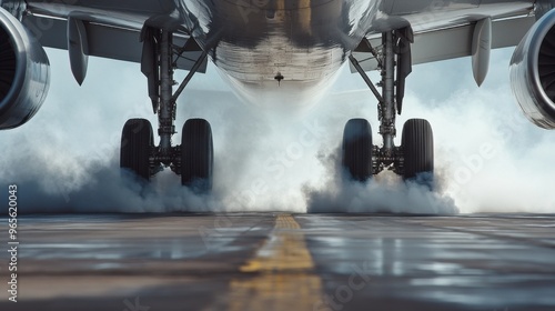 Intense Airplane Landing: Close-up of Wheels Skidding on Runway with Smoking Tires and Vibrating Landing Gear