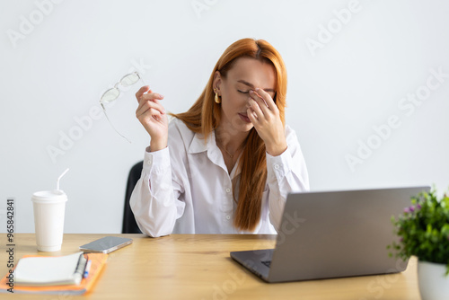Young woman are stressed while working on laptop, Tired businesswoman with headache at office, feeling sick at work