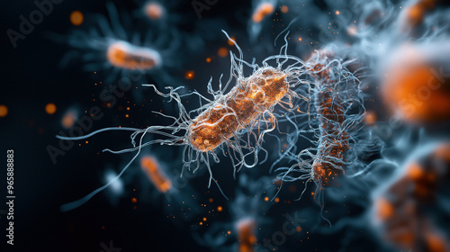 Highly detailed artistic representation of bacteria, likely E. coli, showing their complex structures such as outer membrane and flagella in a dark background with glowing orange hue.