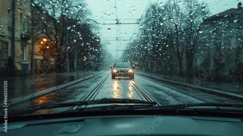Driving in Rain: Wet Road and Tramway Tracks with Raindrops on Windshield