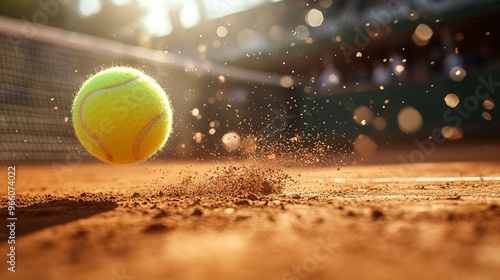 Tennis Ball Hitting Clay Court with Dust Particles - AI generated illustration