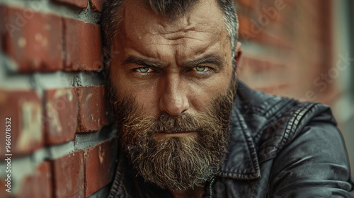 A close-up shot of a man with a rugged beard and intense eyes, wearing a leather jacket, standing against a brick wall.