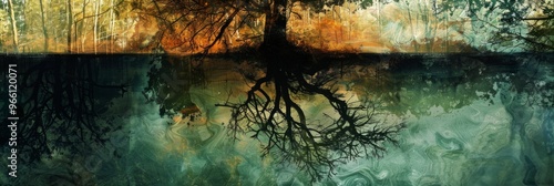 This unique, abstract landscape features upside-down trees with roots suspended in the air crafting an imaginative and peculiar forest that challenges traditional nature, unusualness explosion, banner