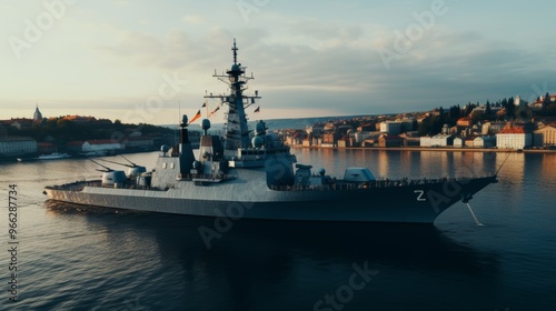 Silhouetted naval warship against serene ocean at sunset for calm seascape scene
