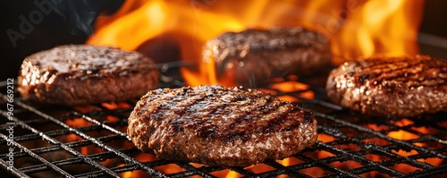 Grilled burgers sizzling over an open flame, showcasing deliciously cooked meat, perfect for summer barbecues and outdoor cooking.