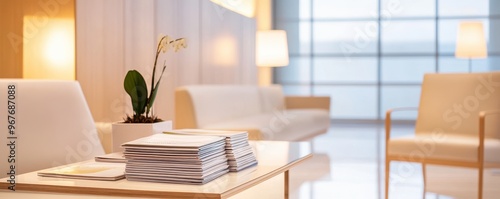 Modern office waiting area featuring comfortable seating, neatly arranged magazines, and a touch of greenery for relaxation.