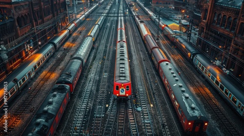 A commuter train yard, the tracks and trains arranged in a precise, patterned layout
