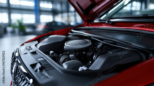 Detailed view of a modern car engine under the hood in a workshop environment, showcasing clean design and technology.