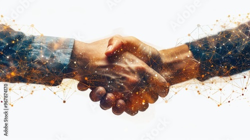 Digital handshake representing virtual business agreement, partnership, and collaboration in modern technology-driven world.