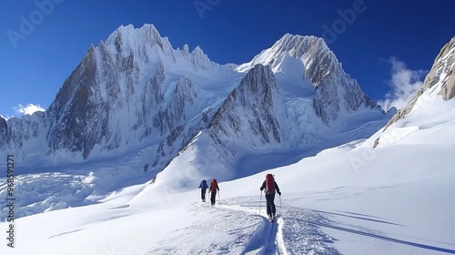 Scenic view of Mont Blanc's summit and north face, including the Dome de Goûter and the intricate maze of ice and seracs on the Bossons Glacier. Ski touring routes lead towards the Gands Mulets hut.