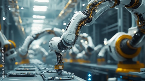AI-powered robotic arms in space construction assembling satellites: Advanced robotic arms in space building and repairing satellites, controlled by AI for precision.