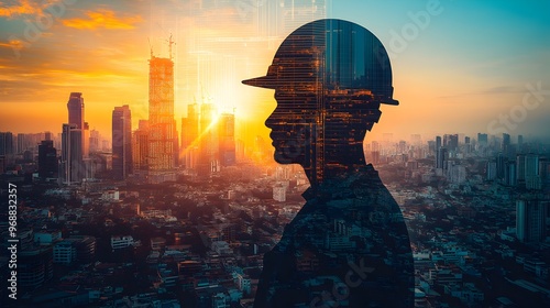 Silhouette of a Construction Worker Wearing a Hardhat Overlooking the Vibrant Urban Skyline with Skyscrapers and Futuristic Architecture at Dramatic Sunset. Concept of Progress,Development.