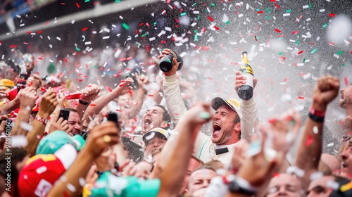 Victory Celebration. Male racer celebrating victory with champagne, surrounded by roaring crowd and confetti