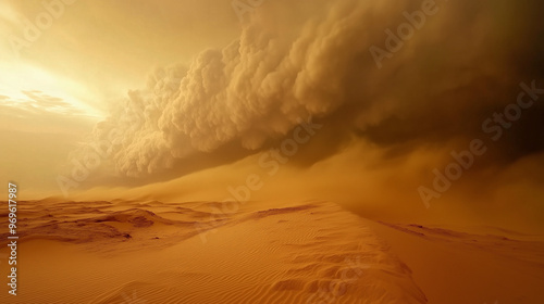 Burza piaskowa wiruje nad pustynią, zasnuwając wszystko wokół gęstymi chmurami piasku. Mocne podmuchy wiatru przemieniają spokojną pustynię w dynamiczny i nieprzewidywalny żywioł.