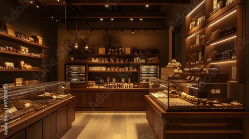 A chocolate shop interior with warm lighting, shelves lined with chocolate bars and truffles, and a chocolate-making station in the center