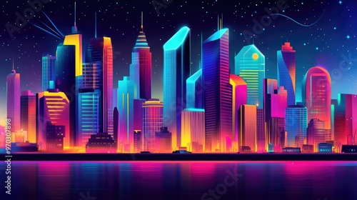 Night cityscape illustration featuring vibrant neon colors dynamic architecture skyscrapers and urban buildings in a bustling metropolis