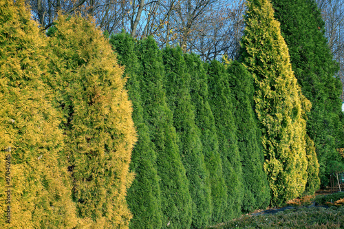 Hedge of colorful Thuja