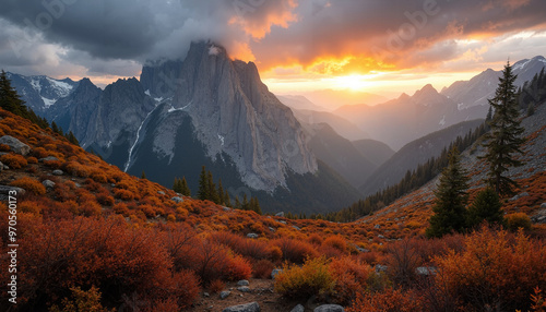 Atemberaubender Sonnenuntergang über Berglandschaft mit Herbstfarben