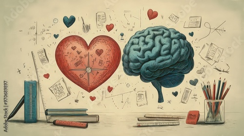 Heart and brain surrounded by books, pencils, and notes, symbolizing balance between emotions and logic in education and creativity.