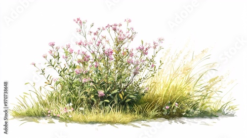 11. Vector of flower grass or blooming shrub site view isolated on white background, watercolor tree elevation for landscape concept, environment panorama scene, eco design, meadow for spring.