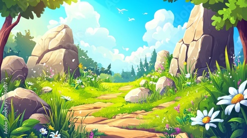 Grass glade lawn in the forest background, bright kids' green field, cartoon style hill in summer sun with clouds bushes and flowers in the garden with fir trees, modern background.