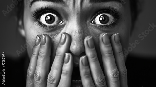 Czarno-biały obraz kobiety z przerażonym wyrazem twarzy, zakrywającej usta dłońmi. Jej oczy pełne lęku i wyraz emocji odzwierciedlają głębokie uczucie strachu i niepokoju.