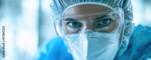 Close-up of technician in protective gear focusing intently with mask and visor in scientific laboratory environment