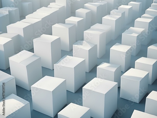 minimalist white cubes arranged in a precise grid, creating a clean and structured pattern with a sense of depth and simplicity