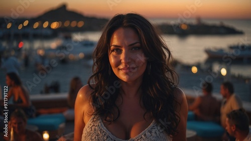 A woman, 35 years old, black hair, European, long hair, curvy body, happy, fashioned, dancing on a summer evening in a ibiza chillout lounge, dreamy