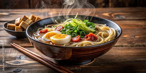 Steaming hot, the bowl erupts with aromatic flavors, a medley of tender noodles, juicy toppings, and savory broth,