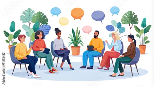 Colorful illustration of diverse individuals sitting in a circle, connected by speech bubbles, surrounded by calming plants, fostering open conversation and emotional support.
