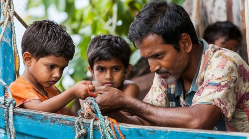 A father tying a knot on a fishing boat with skilled hands while his children watch in fascination