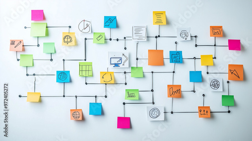 A creative business brainstorming session with sticky notes and mind maps on a whiteboard