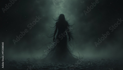 A haunting and ethereal depiction of a soul lost in despair. The image features a solitary figure, shrouded in darkness, adrift in a vast and empty void.