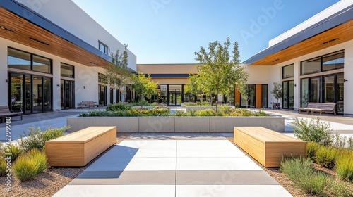 Modern building exterior featuring a courtyard with green space