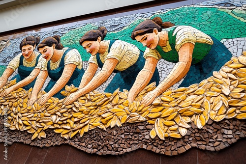 A mosaic of Soviet women harvesting crops, symbolizing the importance of agricultural work in the socialist state