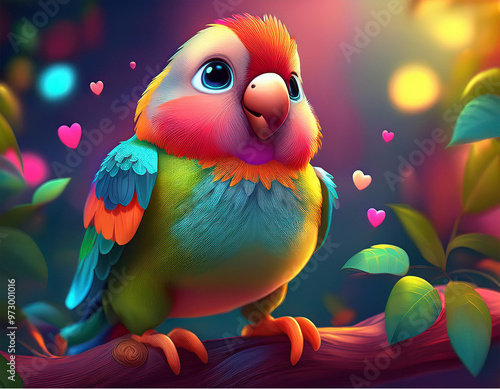 kolorowa tęczowa bajkowa papuga siedząca na gałęzi, otoczona serduszkami - bokeh