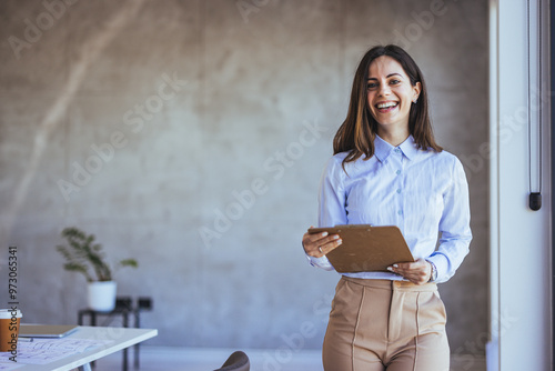Smiling Businesswoman Holding a Clipboard in Modern Office
