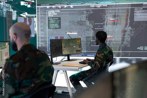 Team of national guard machinists operating on CCTV satellite system, gather intelligence via surveillance footage. Examining all vessels to ensure safety and protection. Military headquarters.