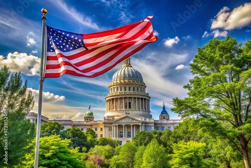 A majesticAmerican flag waves proudly in the wind above the iconic state capitol building, surrounded by lush greenery