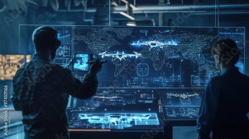 Defense experts evaluating drone schematics on a futuristic AR interface, leveraging three-dimensional data for tactical planning and operational edge