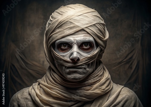 * Halloween mummy portraits scarily wrapped in beige and gray fabric textures with a sense of ancient mysticism and foreboding darkness