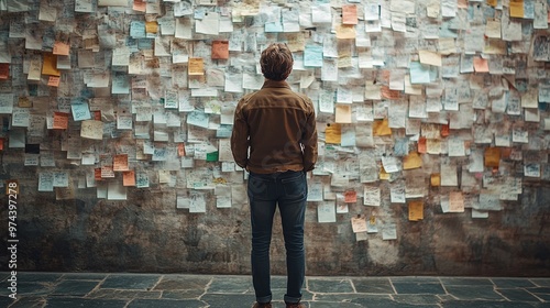creative process scene with man analysing note-covered wall, strategic planning and investigation, focused on research and task