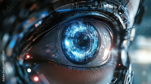 closeup of hyperrealistic robotic eye with glowing blue iris intricate mechanical details and circuit patterns visible in metallic structure surrounding eye